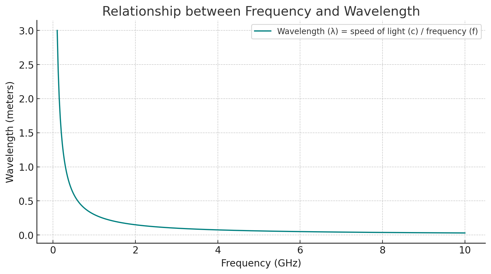 The chart above illustrates the relationship between frequency and wavelength for electromagnetic waves, based on the equation, where is the wavelength, is the speed of light, and is the frequency.