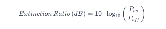 1. In Optical Communications: Extinction Ratio pertains to the ratio of the optical power output when the light source is on (Pon) to the optical power output when the light source is off (Poff). It's usually expressed in decibels (dB) and can be calculated using the formula: