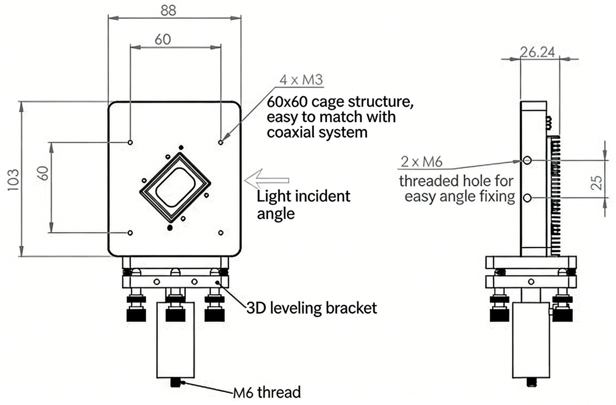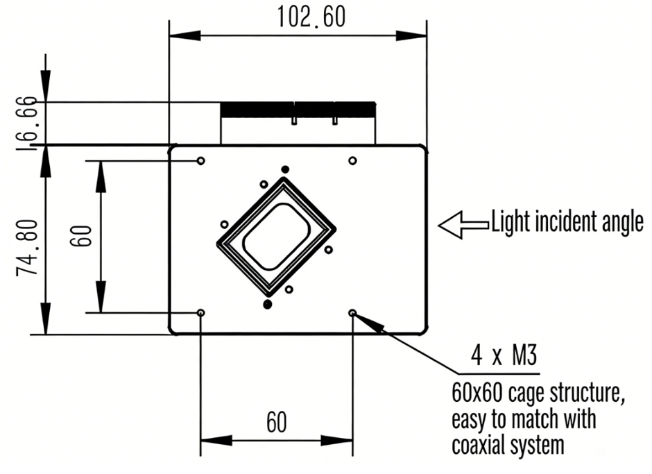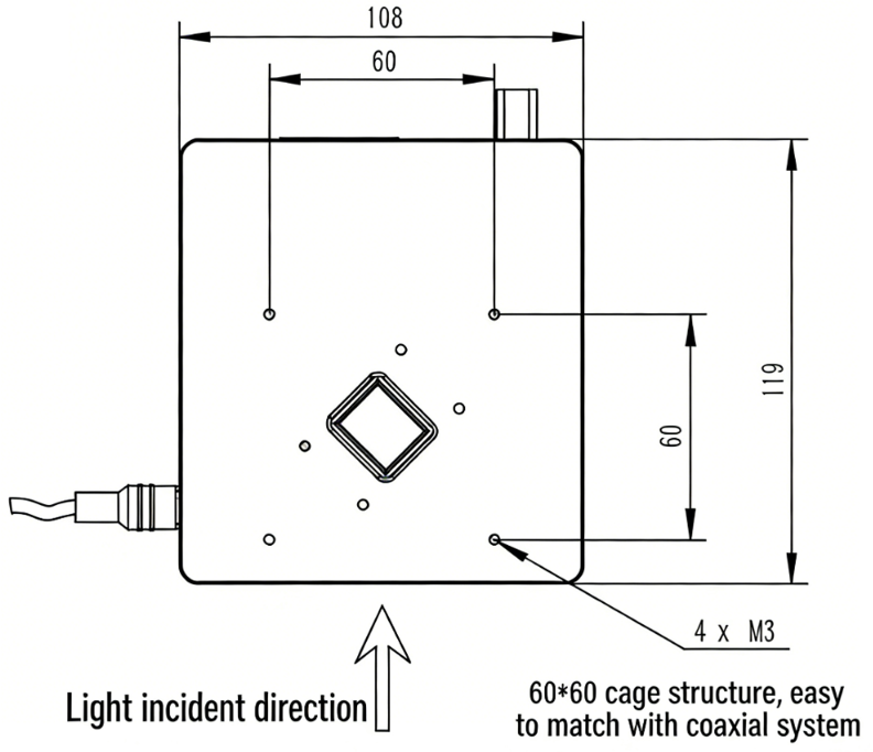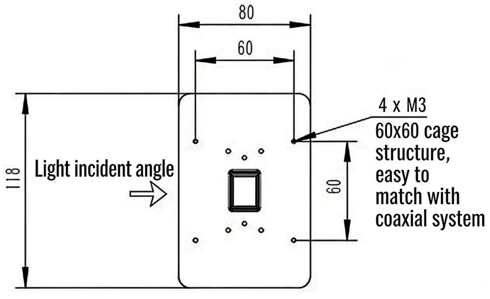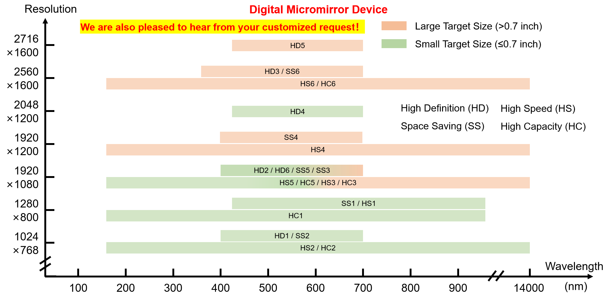 Wavelength Range: "MIR: 3-5 μm", Physical Resolution: "2560×1600", Target Size: "0.9 inch", Storage Capacity: "5T", Micromirror Size: "7.56 μm", Buffer Frame Rate: "1bit: 11764 Hz; 8bit: 522.19 Hz", Deflection Angle: "±12°", Fill Factor: "0.92", Damage Threshold: ">20W/cm²", Gray level: "1-16bit", Mounting type: "0°/Default 45°", Sync trigger interface: "Support", PC interface: "Gigabit Ethernet / USB 3.0 / 10 Gigabit Ethernet", Flex cable length: "31cm", Control software: "HC_DMD_Control", Operating system: "windows/linux", SDK support: "C++/python/labview/matlab/C#"