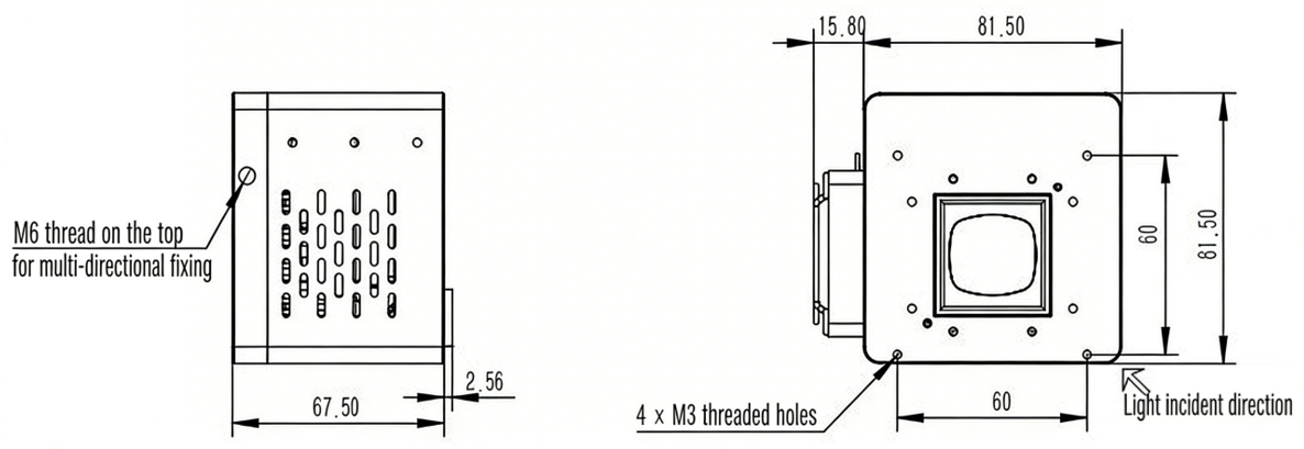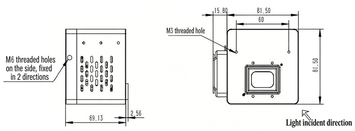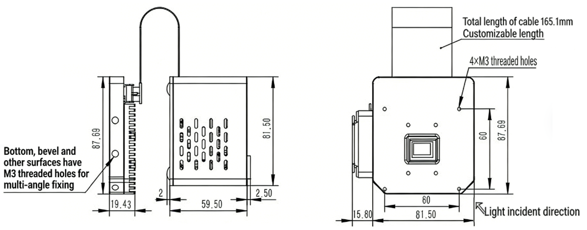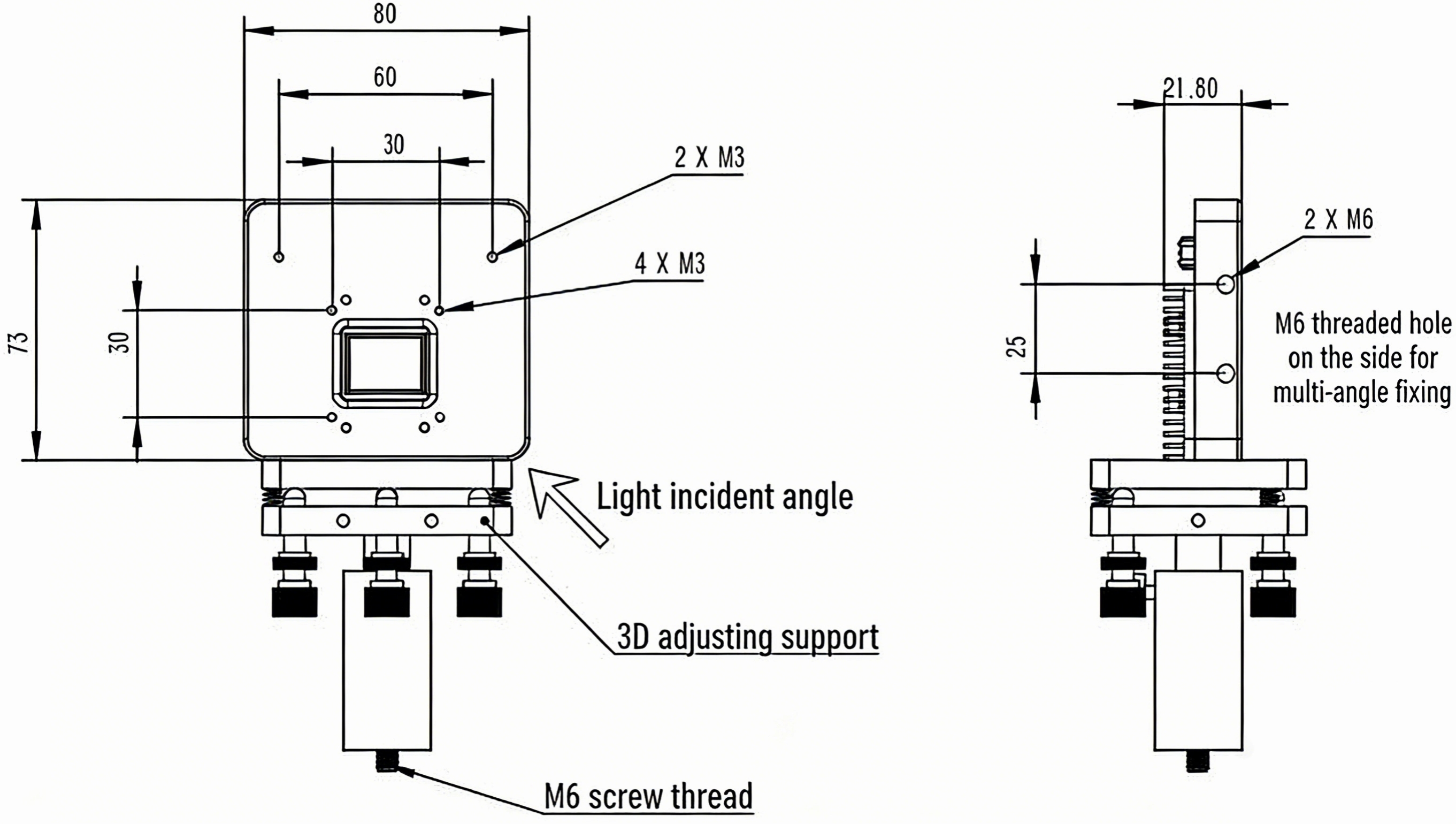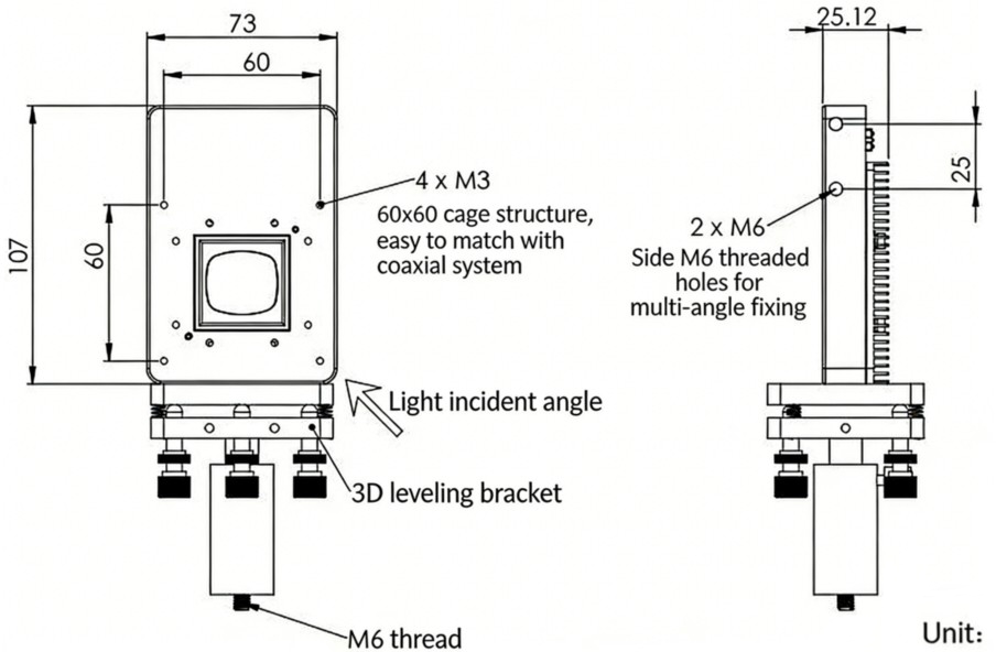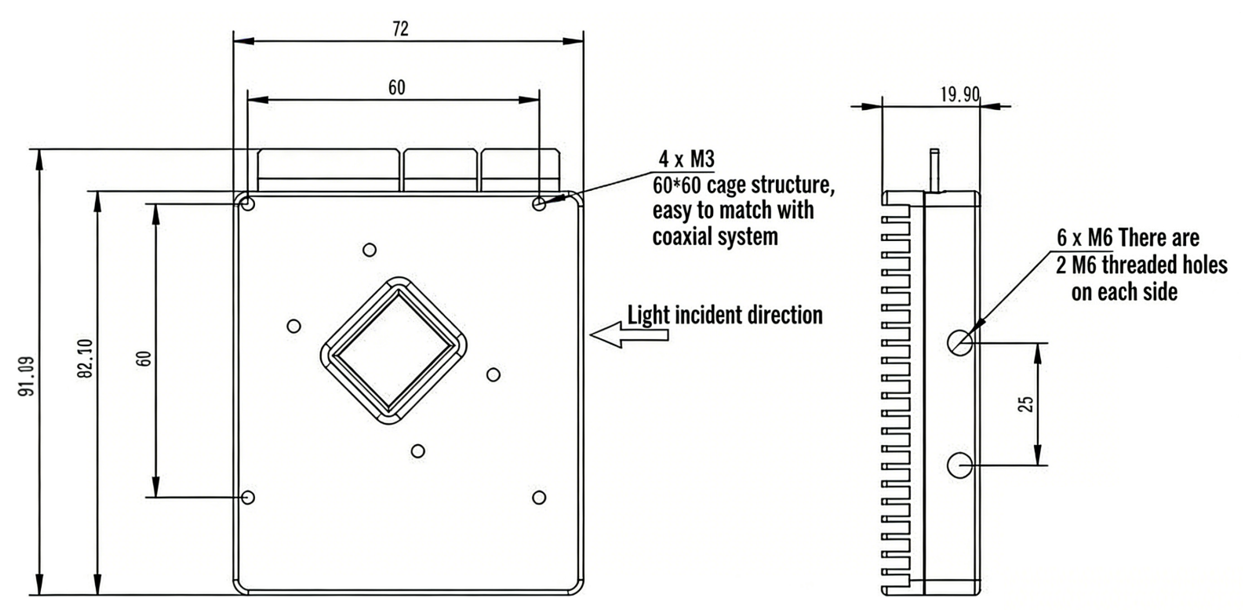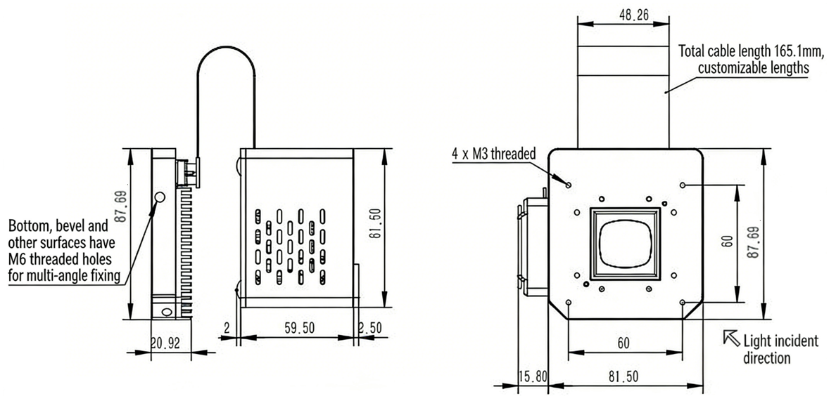 Wavelength Range: "LIR: 8-14 μm", Physical Resolution: "2560×1600", Target Size: "0.9 inch", Storage Capacity: "2.5T", Micromirror Size: "7.56 μm", Buffer Frame Rate: "1bit: 11764 Hz; 8bit: 522.19 Hz", Deflection Angle: "±12°", Fill Factor: "0.92", Damage Threshold: ">20W/cm²", Gray level: "1-16bit", Mounting type: "0°/Default 45°", Sync trigger interface: "Support", PC interface: "Gigabit Ethernet / USB 3.0 / 10 Gigabit Ethernet", Flex cable length: "31cm", Control software: "HC_DMD_Control", Operating system: "windows/linux", SDK support: "C++/python/labview/matlab/C#"