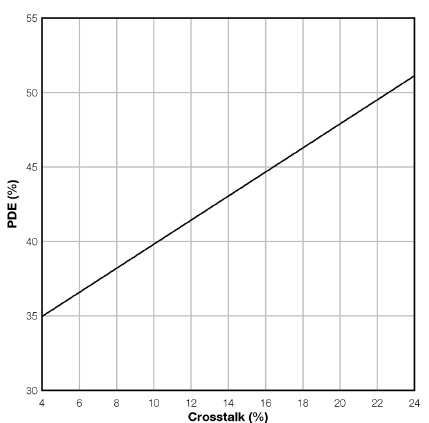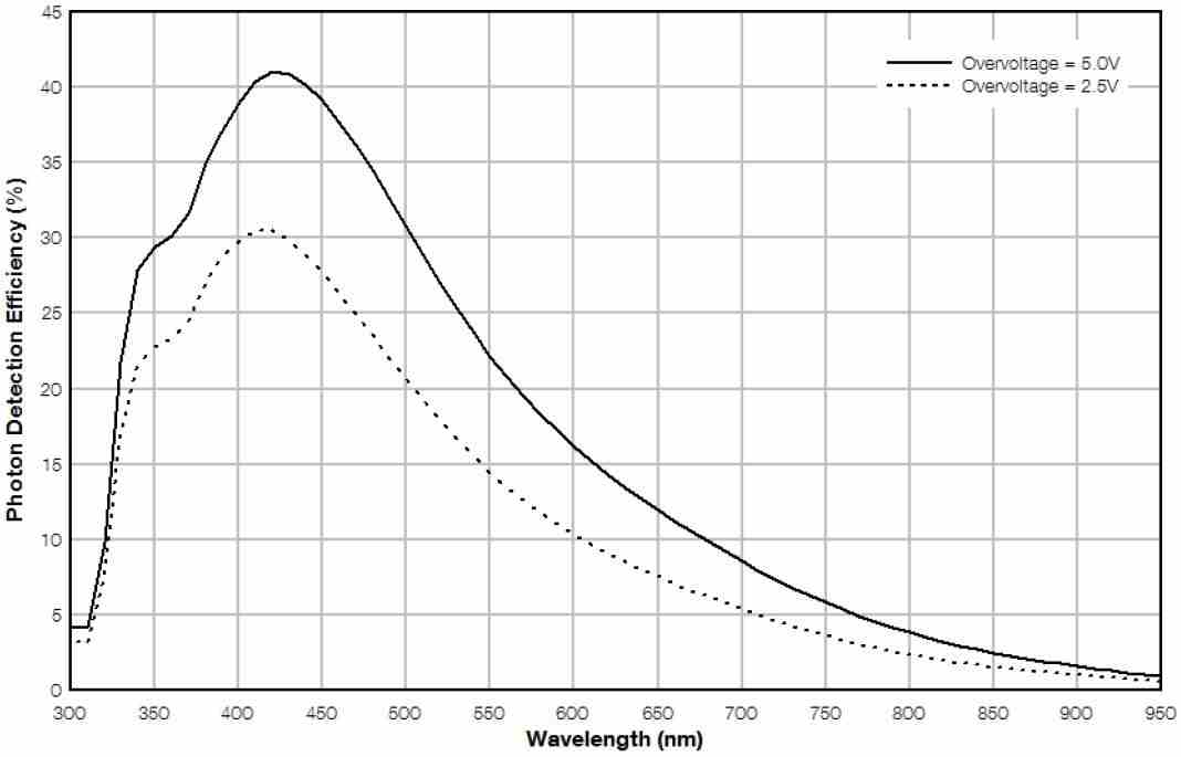 Spectral range:300-950nm;peak wavelength:420nm;dark voltage:2mV;active area:1*1mm;microcell size:35μm; PDE:41%;No. of microcells:504;Gain:3*10^6