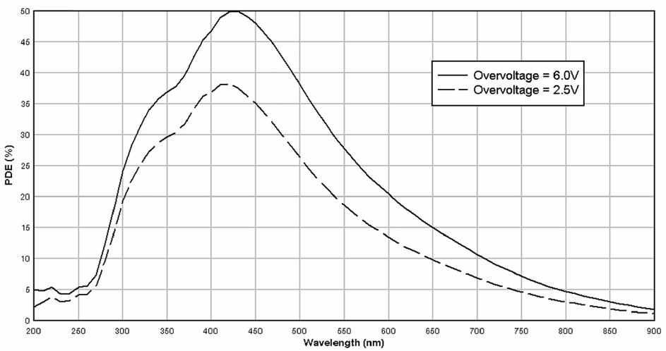 Spectral range:300-950nm;peak wavelength:420nm;dark voltage:2mV;active area:3*3mm;microcell size:35μm; PDE:50%;No. of microcells:5676;Gain:6.3*10^6