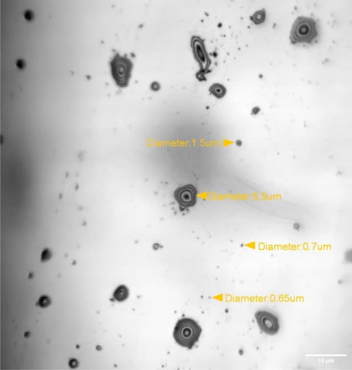 Wafer surface detection,20X Objectivediameter of microcrater 5.5 μmdiameter of defect 1.5 μm、0.7 μm、0.65 μm