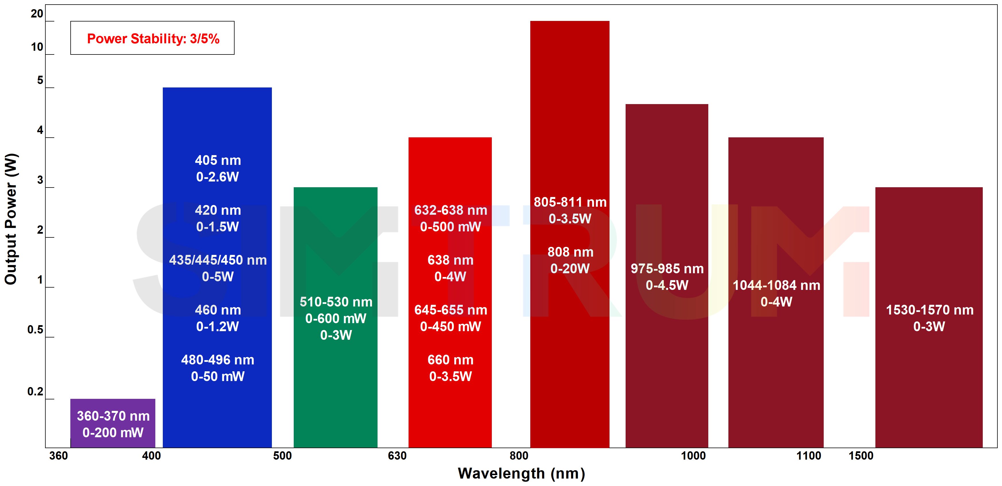 Wavelength: 808±3 nm, Output Power: 0-3 W adjustable, Power Stability: 3%@2 hours, Modulation: TTL modulation, Fiber Parameter: SMA 905, Fiber Length 1 m (Customizable), Fiber Core Diameter: 200 μm, Cooling: Air-cooling+TEC, Dimension: 390*260*149 mm, Power Supply: DC12V