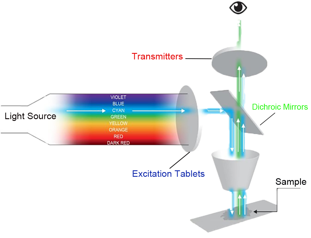 There are many factors that can affect FISH results, including sample preparation and handling, microscopes, light sources, fluorescent probes, and filters. FISH is typically based on a fluorescence microscope to visualize the signal, using three types of filters: excitation plates, dichroic mirrors, and emitting plates. Its working principle is shown in the following figure: