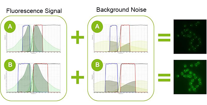 In FISH experiments, the size of the filter bandwidth can have an important impact on the contrast of the FISH image. Increasing the bandwidth improves the excitation and reception efficiency, resulting in an enhanced signal reception. However, the actual received signal includes both the fluorescence signal of the probe and the background noise of the sample, and the increase in bandwidth will increase the intensity of both at the same time. The reduction of the bandwidth reduces the intensity of the background noise, but also reduces the fluorescence signal.