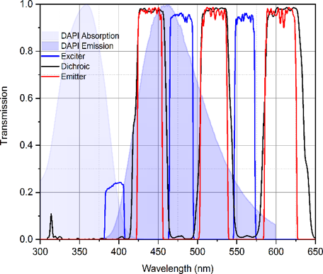 In the multi-color FISH experiment using multi-band filters, in order to avoid the signal of DAPI to mask the signal of other FISH probes, the transmission rate of the excitation plate at DAPI in the multi-band filter group of Chroma will be deliberately reduced to ensure that the DAPI signal is not too high (see the figure on the right).