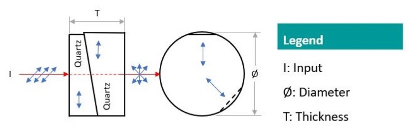 Quartz Lyot Depolarizer is used to convert a polarized incoming monochromatic light beam into a pseudo-random polarized beam. Incoming light beam with broadband source will also be converted by the depolarizer that varies spatially and wavelength. Quartz Lyot Depolarizer is constructed of two crystal quartz wedges. The optical axis of each wedge is along the plane, whereas the orientation angle between the two wedges is 45°. This depolarizer is unique as there is not requirement in orienting the axes of the depolarizer, and is useful if the initial polarization state of incoming light is unknown.