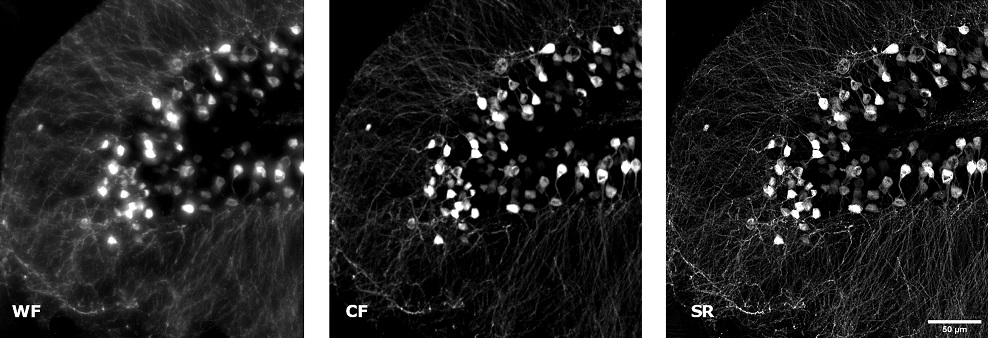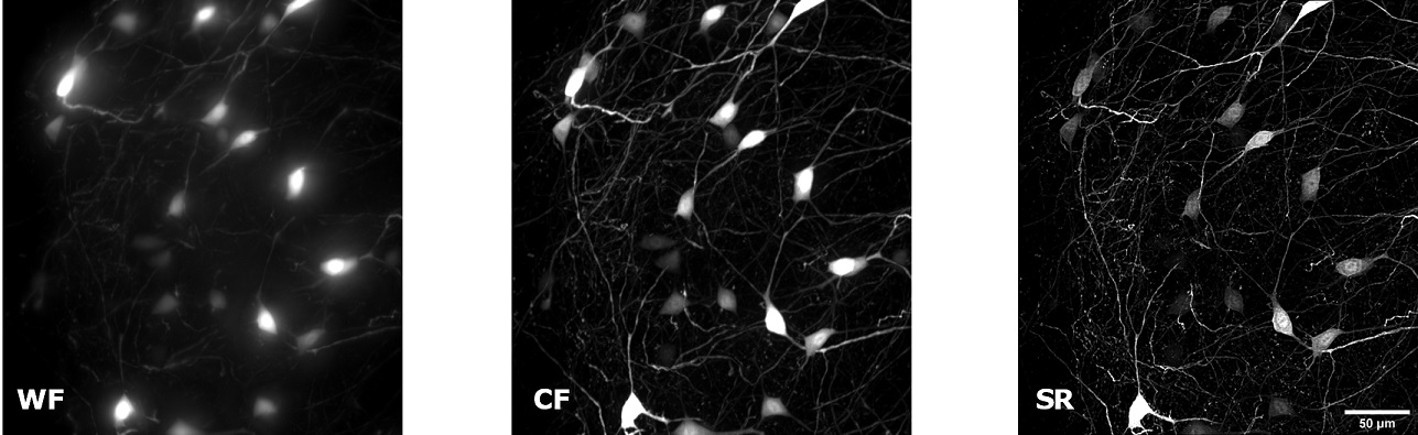 | Clearing reagents can make biological tissues transparent reducing light scattering and enhancing the visualization depth of very thick specimens in depth. However, the SIM Basic can also offer SR inside routinely prepared samples, where the different refractive index of the main biological components causes a greater scatter of light when it travels through the tissue. Therefore, we have tested some conventionally prepared samples, such as brain organoids and mouse brain sections, making acquisitions that are usually done with a confocal microscope. Human whole-brain organoids are able to recapitulate the very first neurodevelopmental events in vitro, both in terms of cellular interactions and tissue architecture, mimicking the real 3D organization of the developing human brain. In Figure 3, a human brain organoid section (50 um thickness) showing CTIP2-positive deep layer cortical neurons (green) and pan-neuronal MAP2 marker (red) is represented. In particular, we focused on a cortical plate performing a comparison between WF, CF spinning disk and SIM Basic SR images acquired with 20X air objective and shown as MIP from Z-stack (15 um). Again, switching between the three acquisition modalities, we obtained a notable increase in resolution and image quality with the SIM Basic, enhancing fine cellular structures of cortical deep-layer neurons that, differentiating towards the periphery, shape the typical laminar cortical structure. In Figure 4, we report images of another conventionally prepared sample: a hippocampal coronal slice from Thy1- GFP mouse brain (50um thickness) and, analyzing the acquisitions made with 20X air objective (Figure 4A), the resolution gain obtained with the SIM Basic is evident, also in this very scattering sample. Furthermore, focusing on neuronal details inside the intricate organization of the hippocampal neuronal network, we compared the 20X SR acquisition with a 60X CF image. As nicely reported in figure 4B, the SIM Basic equipped with the 20x air lens allows reaching an image quality comparable to those obtained with the CF spinning disk equipped with the 60X oil objective. In conclusion, all these data taken together demonstrate the capability of SIM Basic to bring out fine details in extra-large objects using routine preparation protocols. Affordable easy-to-use low magnification dry objectives can also be used to acquire both conventional and non-conventional specimens, doubling the objective performance and obtaining an image quality very similar to that reached with immersion lenses. The use of the SIM Basic with low magnification objectives allows benefiting all the advantages of an air lens, like the absence of immersion media or a greater working distance, without compromising the quality of the image. This type of configuration greatly increases the plasticity of the system and gives our customers more flexibility in applications, applying the SIM Basic as a powerful platform for SR imaging and laying the foundations for the use of SR in high-content screening. |
