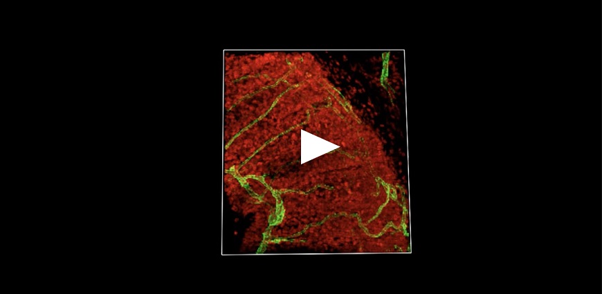 | To demonstrate the SIM Basic optimal performance also with low magnification objectives, we compared Widefield (WF), Confocal (CF), and SR images in complex and thick cleared biological samples using a CFI Plan Apo Lambda 20X air objective (NA 0.75, WD 1). In Figure 1, different visualizations of a cleared mouse intestine section (0.55 mm thickness) with blood vessels in green and nuclei in red are shown. In particular, thanks to the fast switch between three microscopy methods, we report a global comparison of WF, CF spinning disk and SR acquisitions of a volume of 125 um (Figure 1A) and a 3D movie of the SIM Basic SR acquisition showing fine details of intestinal villi (Figure 1B). In Figure 2, a cleared mouse brain section (0.55 mm thickness) with GFP-expressing neurons is shown. Notably, we acquired a 150 um Z stack of an intricate neuronal network shown as maximum intensity projection (MIP) (Figure 2A) and 3D volume view (Figure 2B). As nicely appreciated from these images, switching from WF, CF and SR modalities allows reaching an increasing resolution gain that enhances the fine details of the neuronal network even at high thickness. Moreover, we decide to compare the 20X SR acquisition with a 60X CF acquisition and, as demonstrated in figure 2C and 2D, the acquisitions with the SIM Basic not only allow to have an evident resolution improvement compared to the 20X CF acquisitions, but it enables to reach an image quality comparable to those obtained with the CF spinning disk equipped with a CFI Plan Apo Lambda 60X oil objective (NA 1.4, WD 0.13). In addition to a noticeable enhancement in neuronal details quality with respect to a 20X CF (Figure 2D), the use of the SIM Basic with 20X objective allows going even deeper into the sample than what is permitted by the maximum working distance of a common 60X oil objective (130 um) (Figure 2C).
